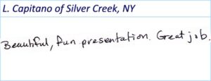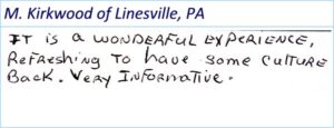 As accuracy is everything when it comes to public opinion, and many social media platforms now offered provide generated and or paid for artificial results, the following stenographic evidence reflects first hand unbiased visitor reviews or “likes” regarding the impact of Michael Felk’s Tinsmithing Shows per venue served in the recent period. As multiple reviews are obtained per event the following would reflect only a sampling per venue dated below.