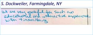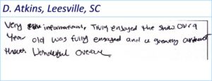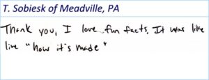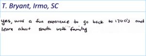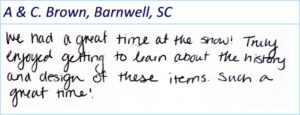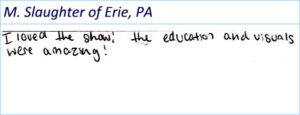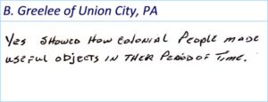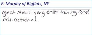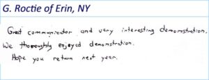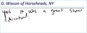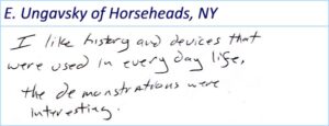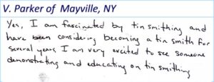 Show visitors are voluntarily offered the opportunity to register at the conclusion of the show, included with contact information a space is provided to answer the following question: Did you enjoy the Tin-smithing demonstrational show?